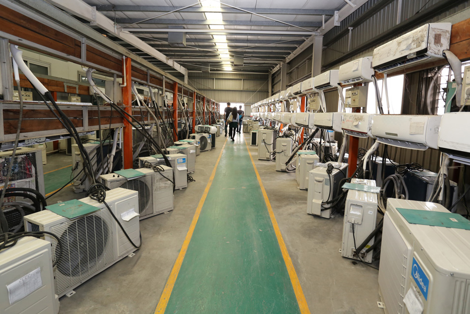 現(xiàn)在的空調(diào)生產(chǎn)線,出現(xiàn)的已不再是擁擠忙碌得跟陀螺似的產(chǎn)業(yè)工人。因?yàn)椴簧俚?span lang="EN-US">“機(jī)器手”、“機(jī)器人”的出現(xiàn),勞動密集型的家電制造工廠被賦予了全新的“科技感”和“智能化”的色彩。在空調(diào)室內(nèi)、外機(jī)總裝線體的末端,裝箱、打包等繁重環(huán)節(jié),早已被機(jī)器人所取代。當(dāng)成品從生產(chǎn)線上完成之后,也是通過機(jī)器手直接搬運(yùn)到流轉(zhuǎn)板上。